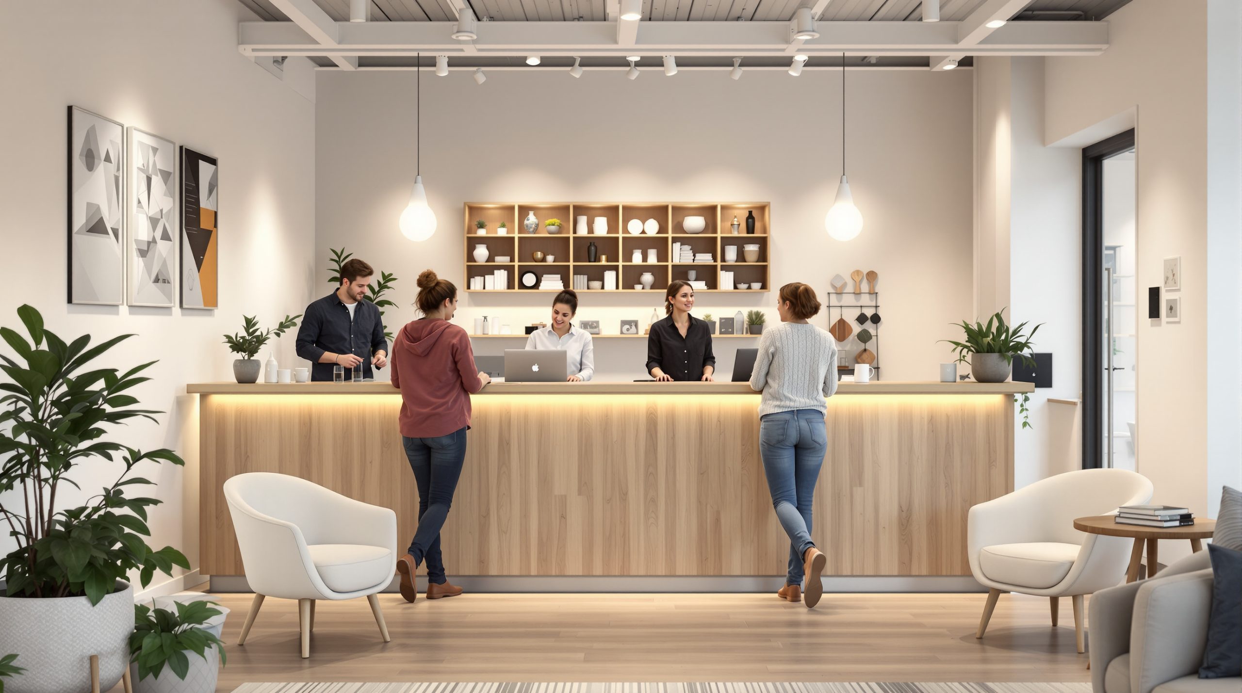 Le design des banques d’accueil arrondies est souvent mis en avant pour son esthétique douce et accueillante. En comparaison, la banque d’accueil IKEA propose des lignes modernes avec un mobilier en crème et bois clair qui crée une atmosphère paisible. Les bords arrondis de certaines créations favorisent un environnement convivial, tout en permettant une circulation fluide. Ce type de design est particulièrement adapté aux espaces où le confort et l’interaction sont prioritaires, rendant les échanges plus naturels et moins formels.